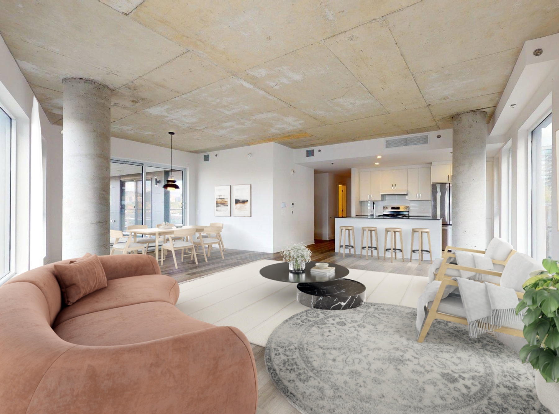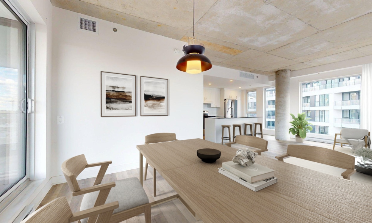 Cuisine ouverte, salle à dîner lumineuse, salon spacieux : votre nouvelle vie s'articule autour de cette vue imprenable sur le cœur créatif de Griffintown.