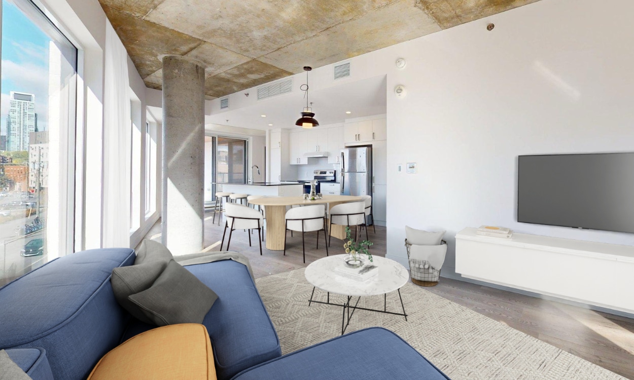Du confort de votre salon, admirez l'horizon du centre-ville qui s'illumine à travers votre aire de vie ouverte.